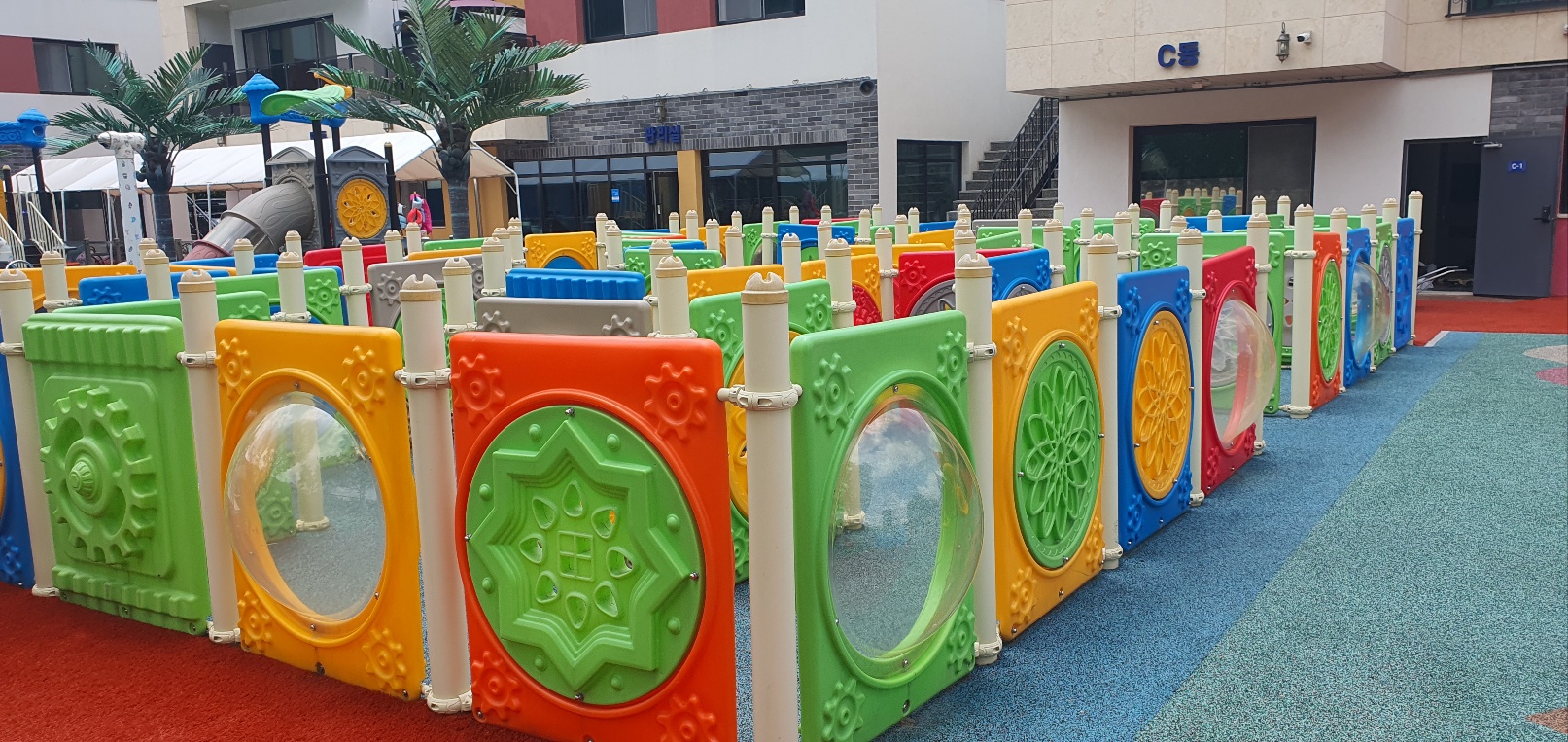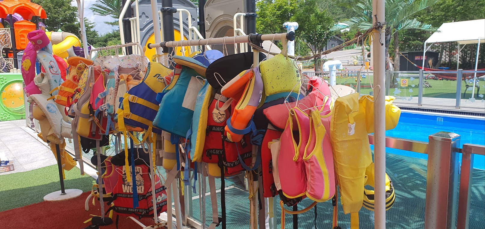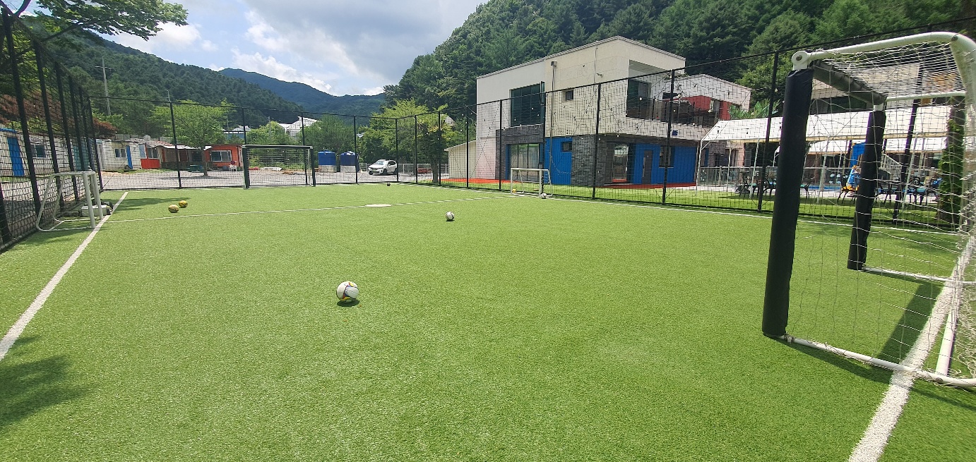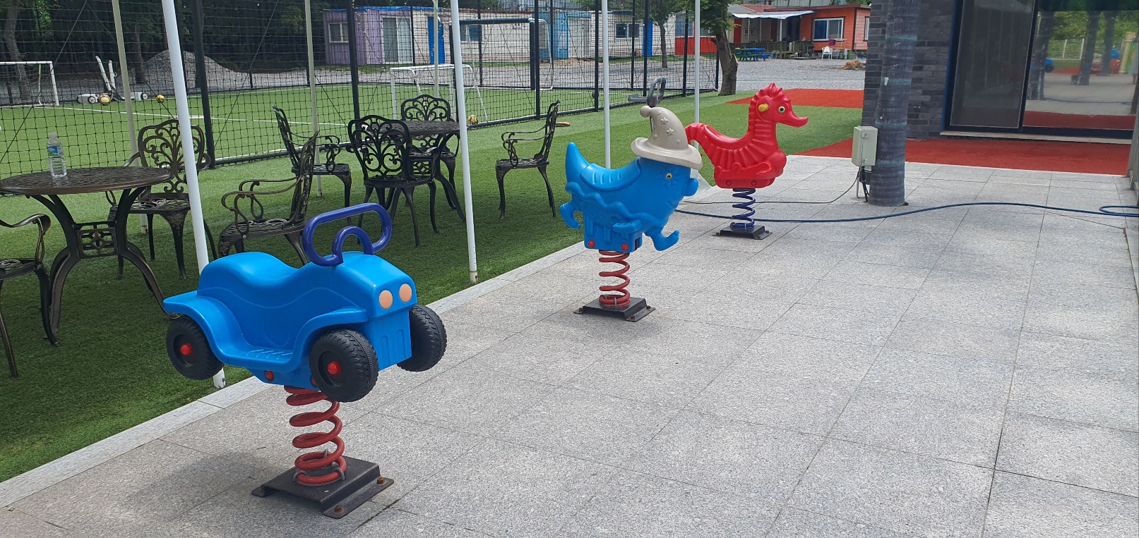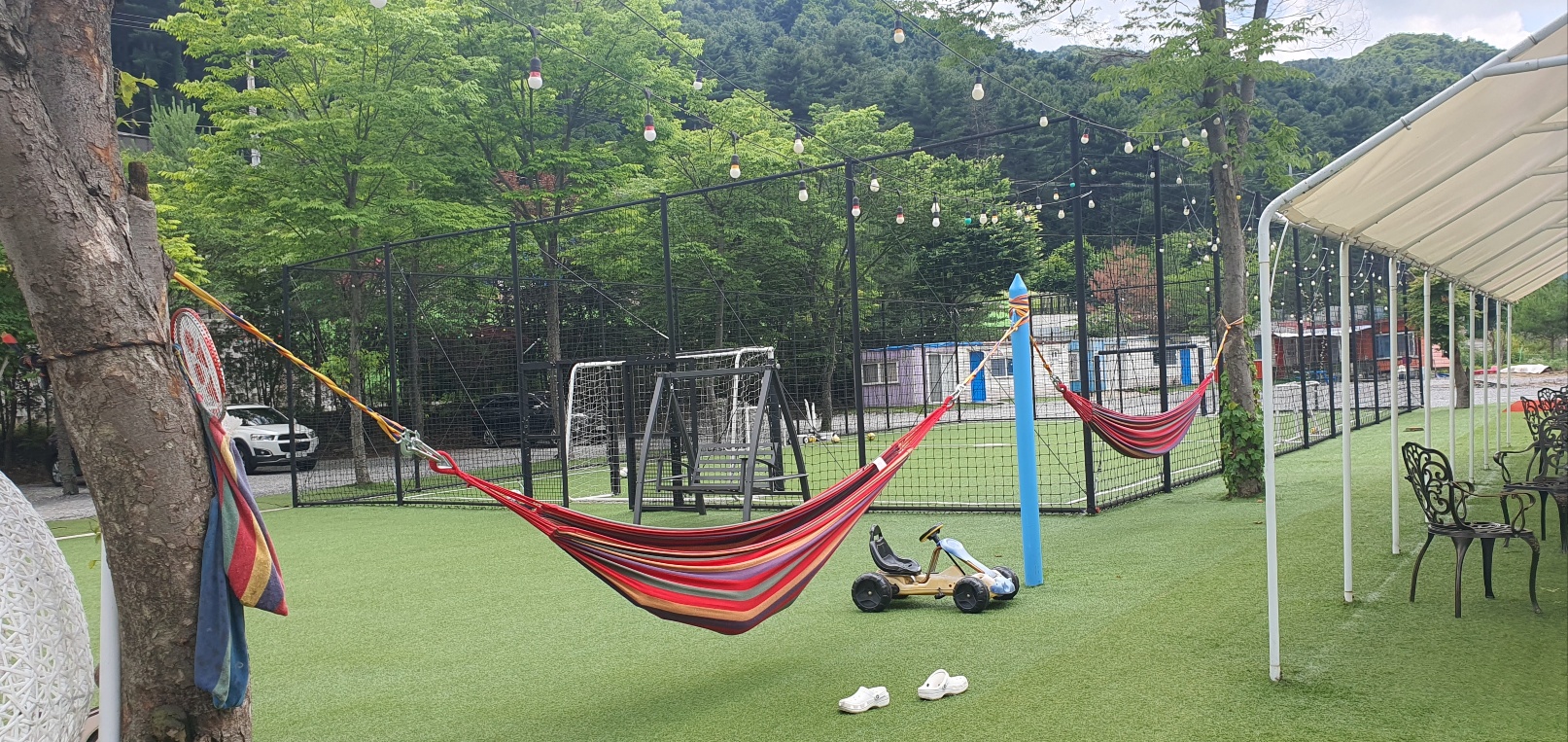 입구에 들어서면 바로 놀이터, 미로 찾기, 해먹, 축구장, 여러 탈것들, 풀장이 있습니다.