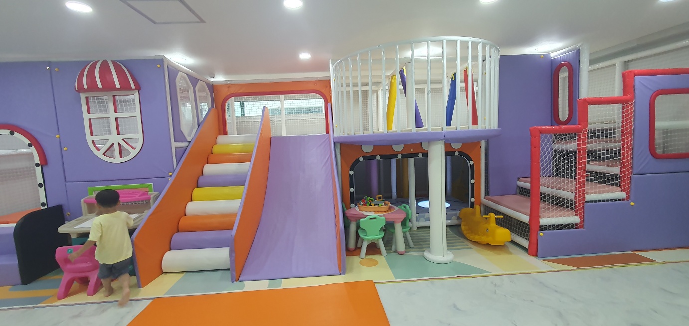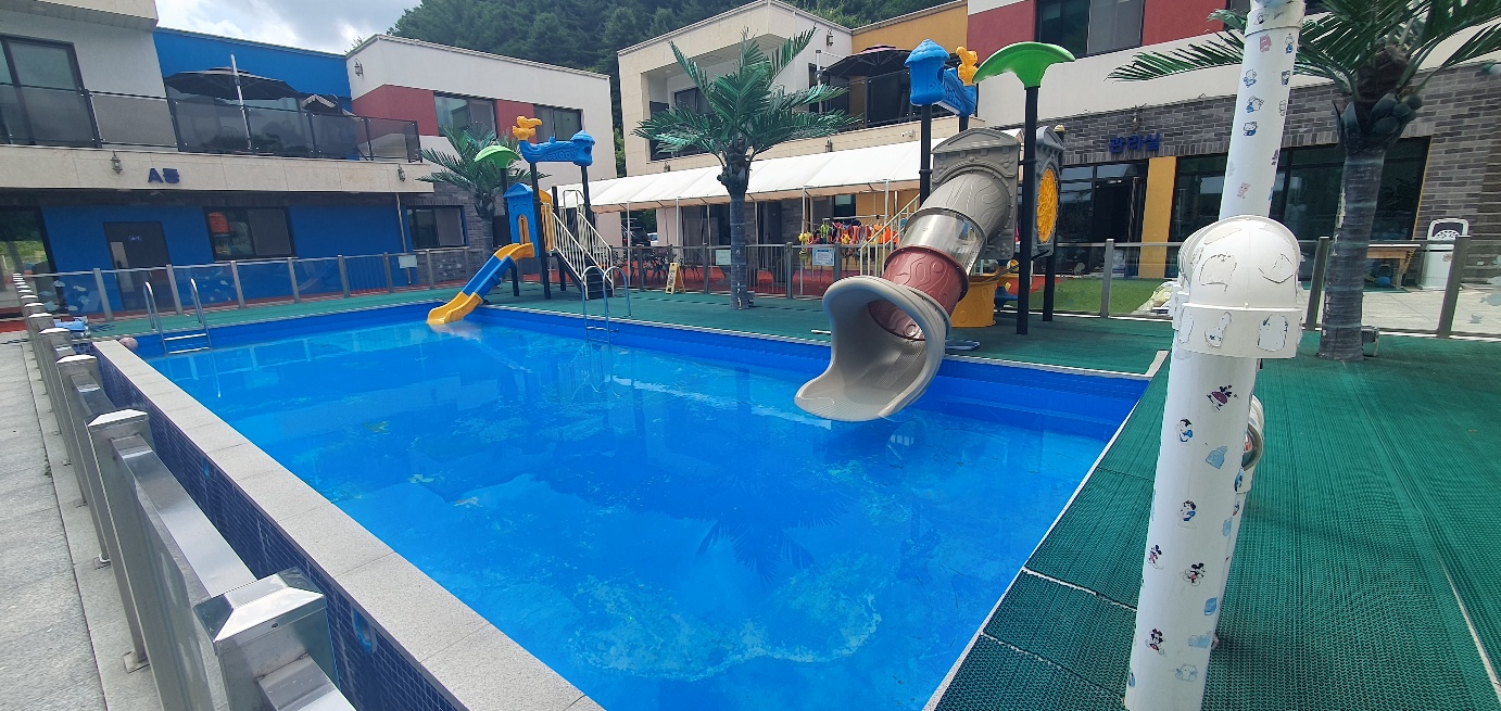 바닥이 안전한 소재라서 아이들이 넘어져도 크게 다치지 않을 것 같아서 다행이었고 한 공간에 여러 가지를 할 수 있어서 아이들이 놀기에 최적이라고 생각이 듭니다. 3시 입실이지만 일부러 일찍 1시에 도착하여 수영을 할 수 도 있고 놀이터에서 놀 수도 있습니다.