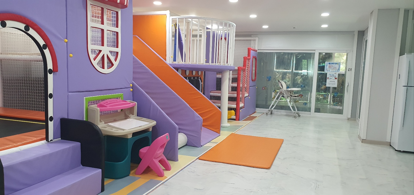 룸 안에 키즈시설이 아이들이 넘어져서 부딪혀도 많이 다치지 않도록 꼼꼼하게 스펀지가 붙어져 있었습니다.