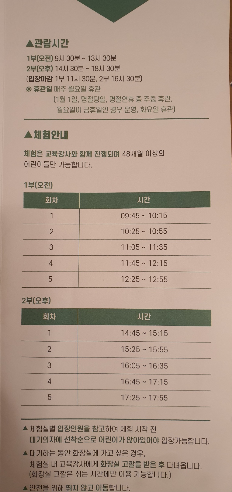 체험 5개를 하고 나니 다른 시설들을 제대로 이용하지 못했습니다.
