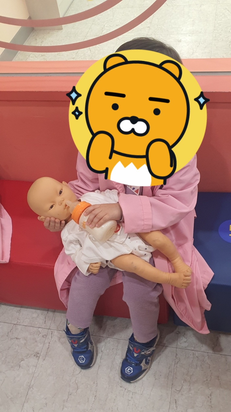아이들이 직접 아기 인형에게 우유주는 연습을 하고 사진을 찍는 시간도 따로 줍니다.