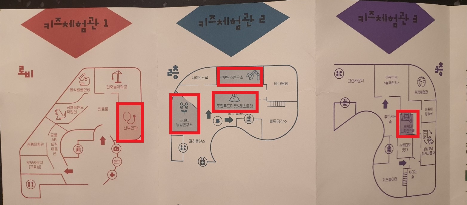 로비에서 예약 확인 -> 2층 로컬푸드 마켓&레스토랑 -> 2층 로보틱스연구소 -> 2층 스마트농업연구소 -> 3층 캐릭터 디자인스쿨 -> 1층 산부인과 순으로 체험하였습니다.