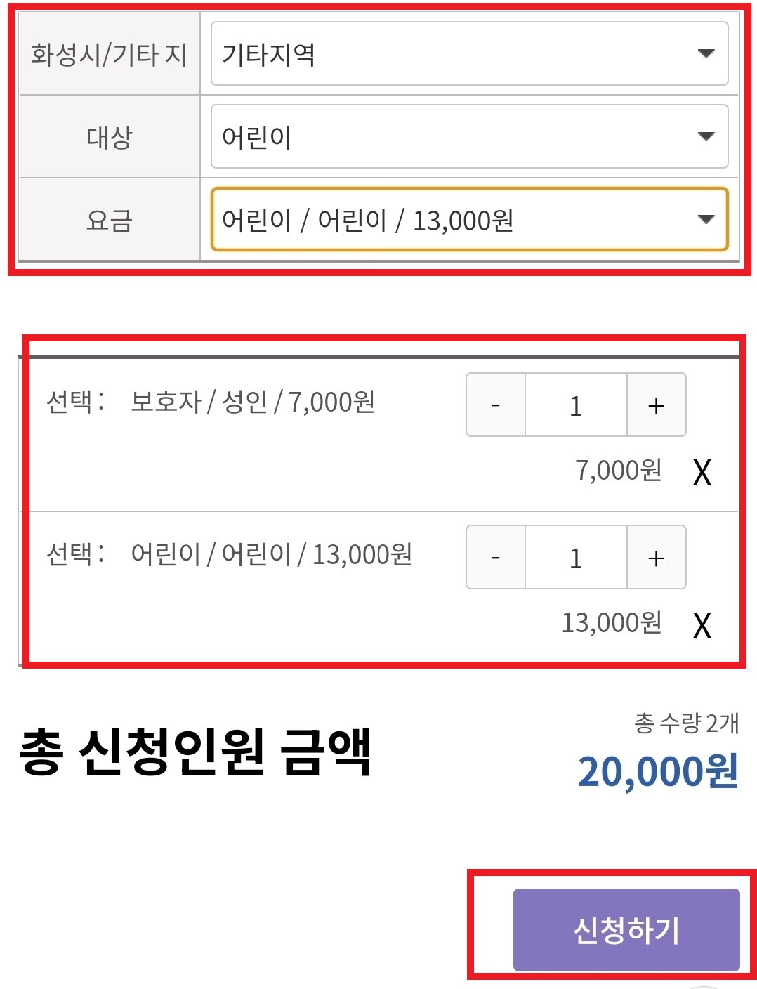 4. 아이와 보호자 선택 후 신청하기를 누르고 결재하시면 됩니다.