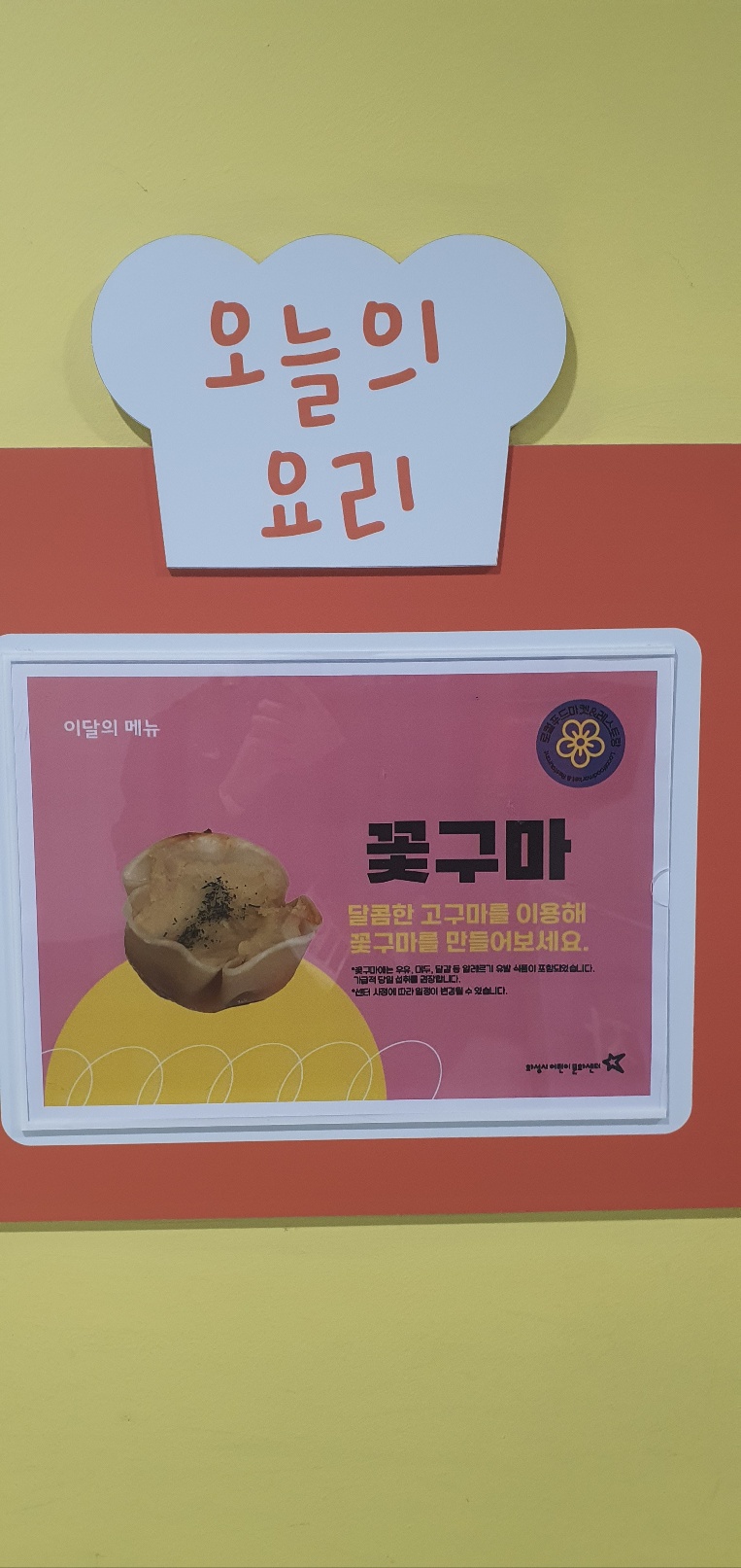 오늘의 요리는 꽃고구마 만들기 체험을 하였습니다. 수업의 요리주제는 바뀌는 듯합니다.