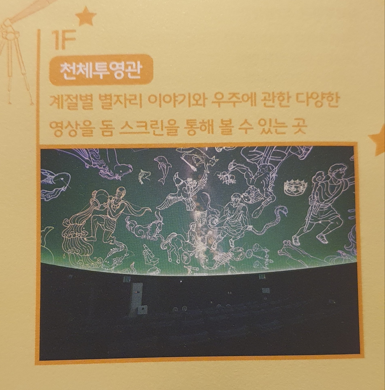 1층 천체투영관: 계절별 별자리 이야기와 우주에 관한 다양한 영상을 돔 스크린을 통해 볼 수 있는 곳.