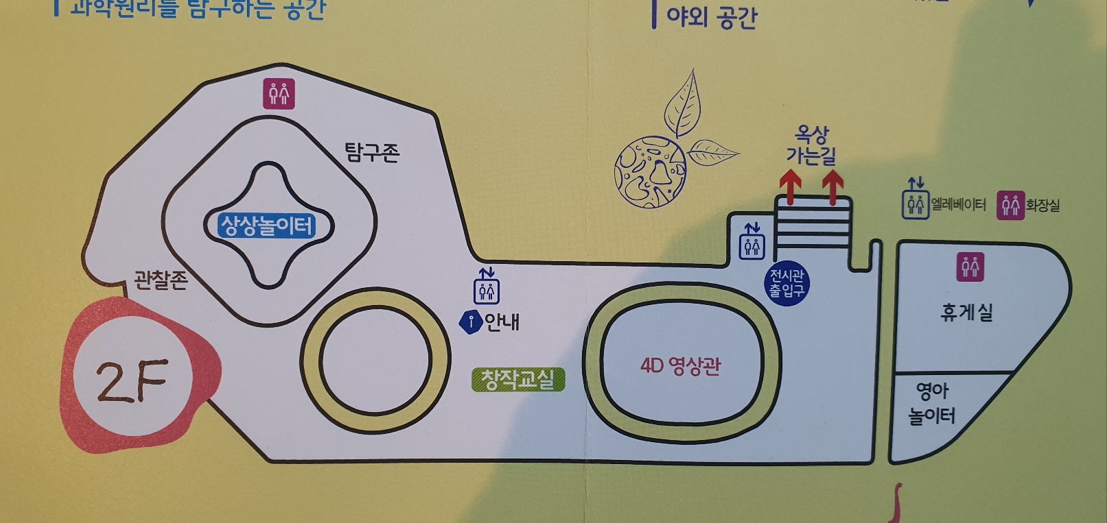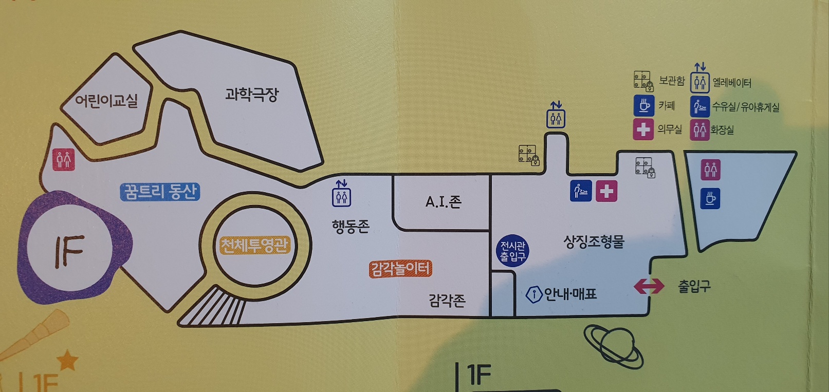 1층: 매표소, 감각놀이터, 천체투영관, 상징전시물, 과학극장, 어린이교실