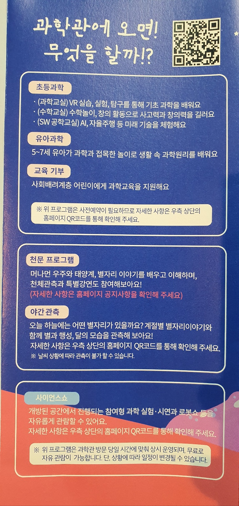 • 관람소요시간: 과학관에서 권장하는 시간은 2시간입니다. 2시간이 넘었다고 퇴장하라고는 하지 않지만 사람이 많을 경우 2시간 정도로 제한해 주라고 했습니다. 저희는 12시 30분 예약을 했는데 관람 후 나온 시간은 3시 40분이었습니다. 총 3시간 10분을 과학관 안에 있었습니다. 아이의 연령이나 관심도에 따라 소요시간은 다를 수 있습니다.