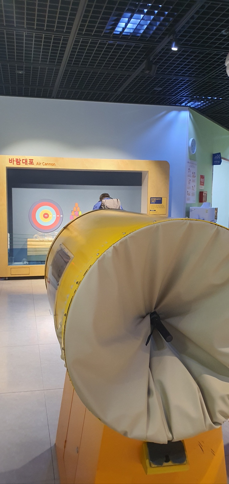 바람대포에서도 시간을 꽤 보냈는데 앞에 플라스틱 컵을 놓고 통에 있는 손잡이를 잡아 당겨 놓으면 플라스틱컵들이 넘어집니다. 인기가 많아요!