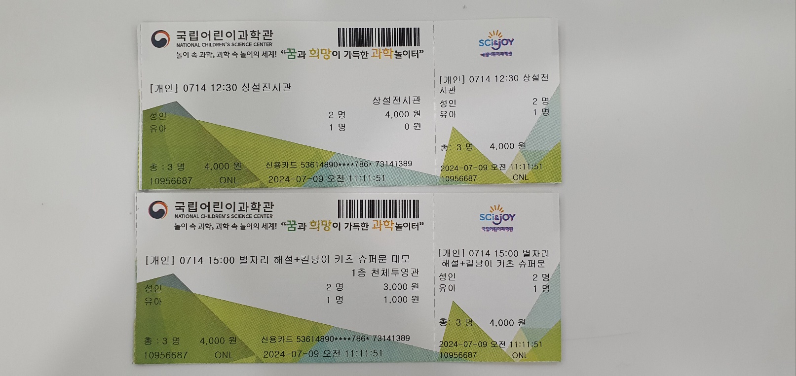 • 입장료(관람료): 성인 2000원 *2명  + 만 5세(미취학아동) 무료 1명 -> 총 4000원