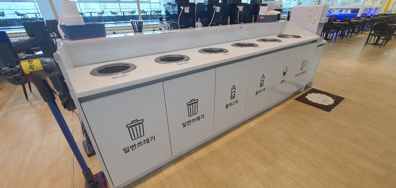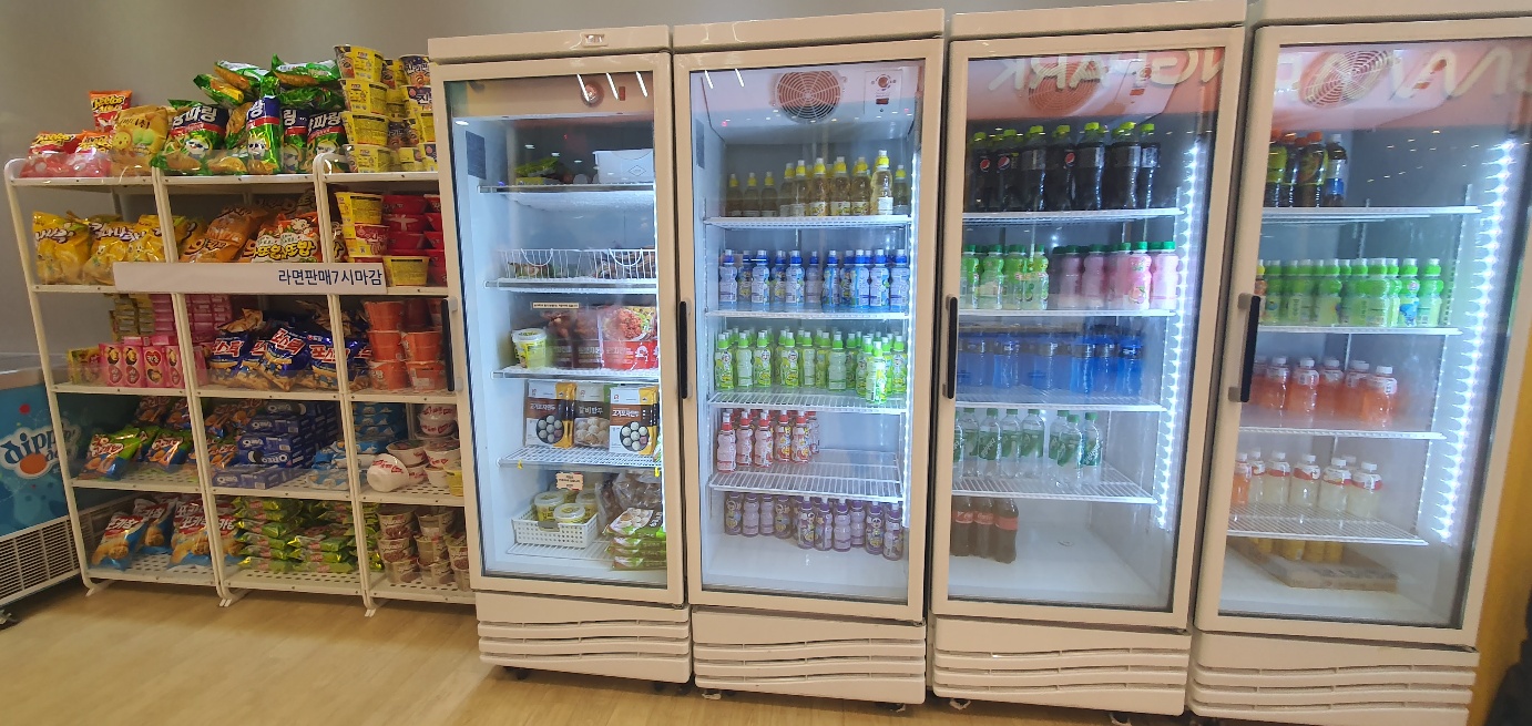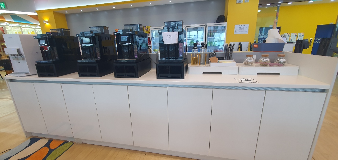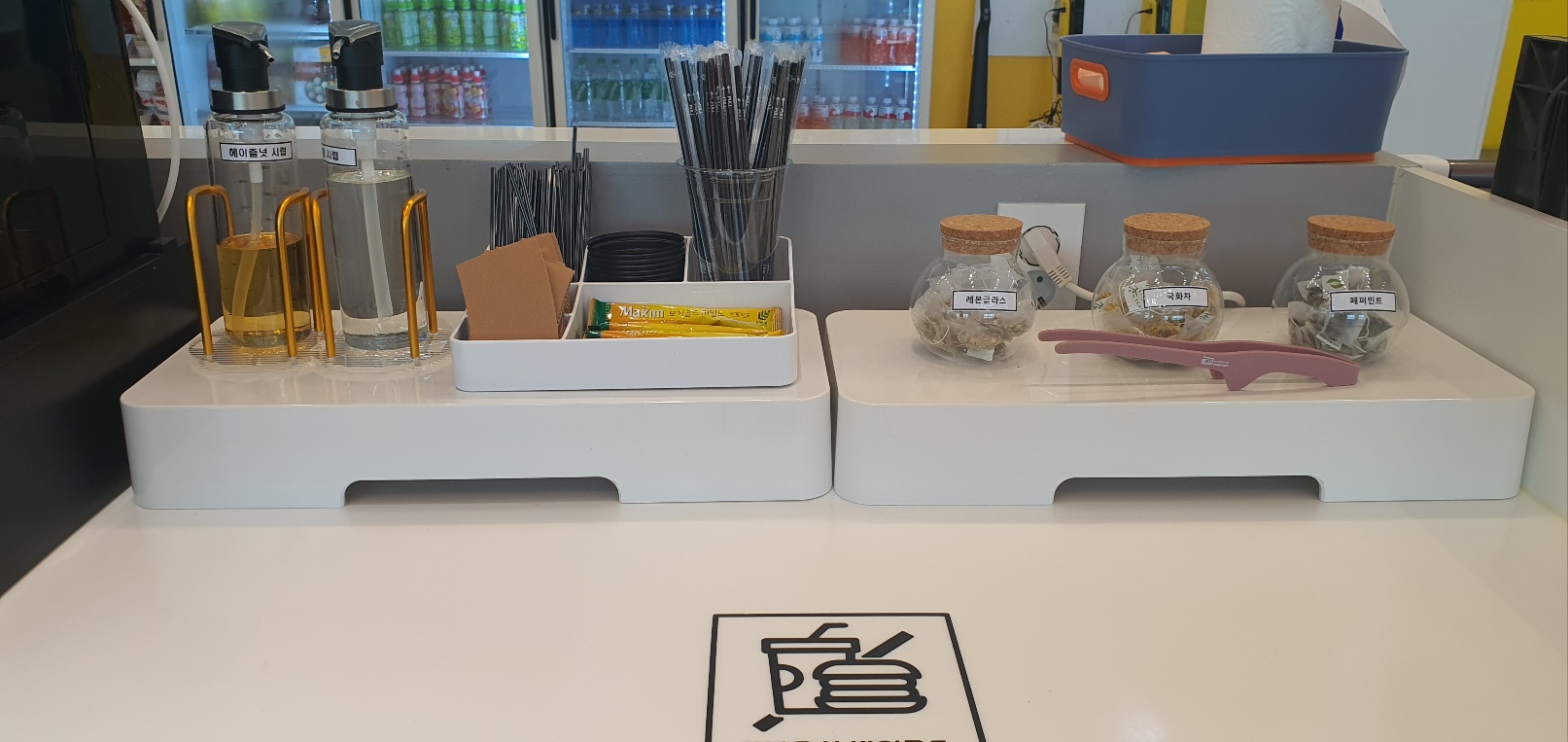 정수기, 커피머신, 시럽, 티백, 스트로우 준비 됨. 인포데스크에서 준 종이컵에 원하는 음료를 담아 마십니다.