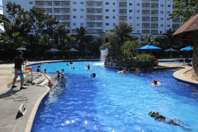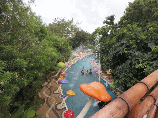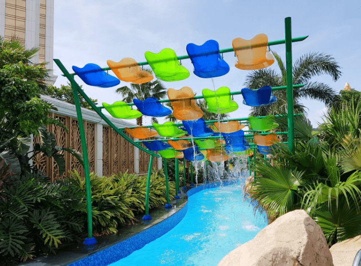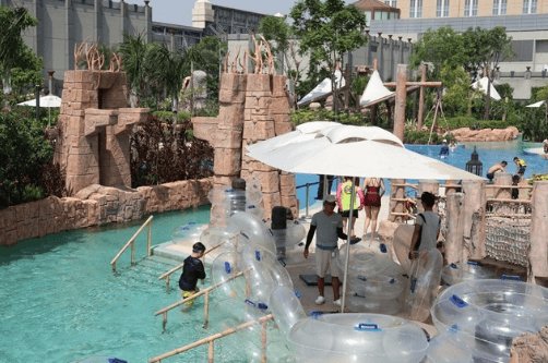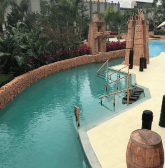 인근의 메리어트 호텔 수영장도 사용할 수 있습니다. 걸어가기에 약간의 거리가 있지만 볼거리가 많아 지루하진 않아요. 메리어트 호텔에는 유수풀이 있는데 통유리 풀장이 매우 유명하답니다. 생각보단 볼 때만 신기하고 막상 유수풀에 들어가면 특별한 건 없어요. 유수풀을 타고 다니면 중간중간에 물폭탄들이 떨어져서 물놀이를 마음껏 즐길 수 있습니다.