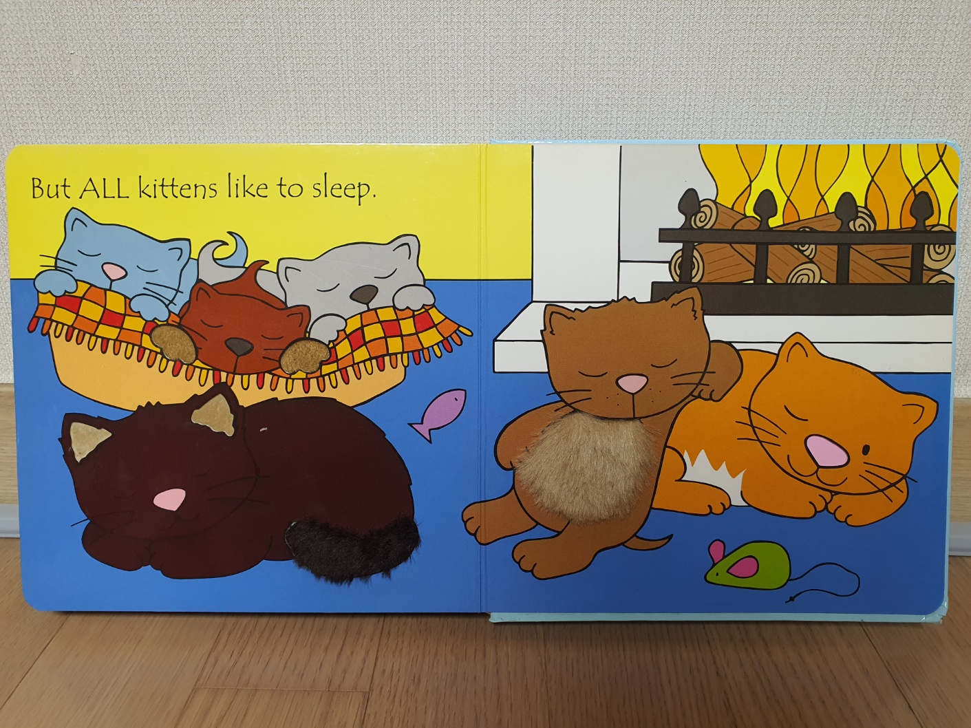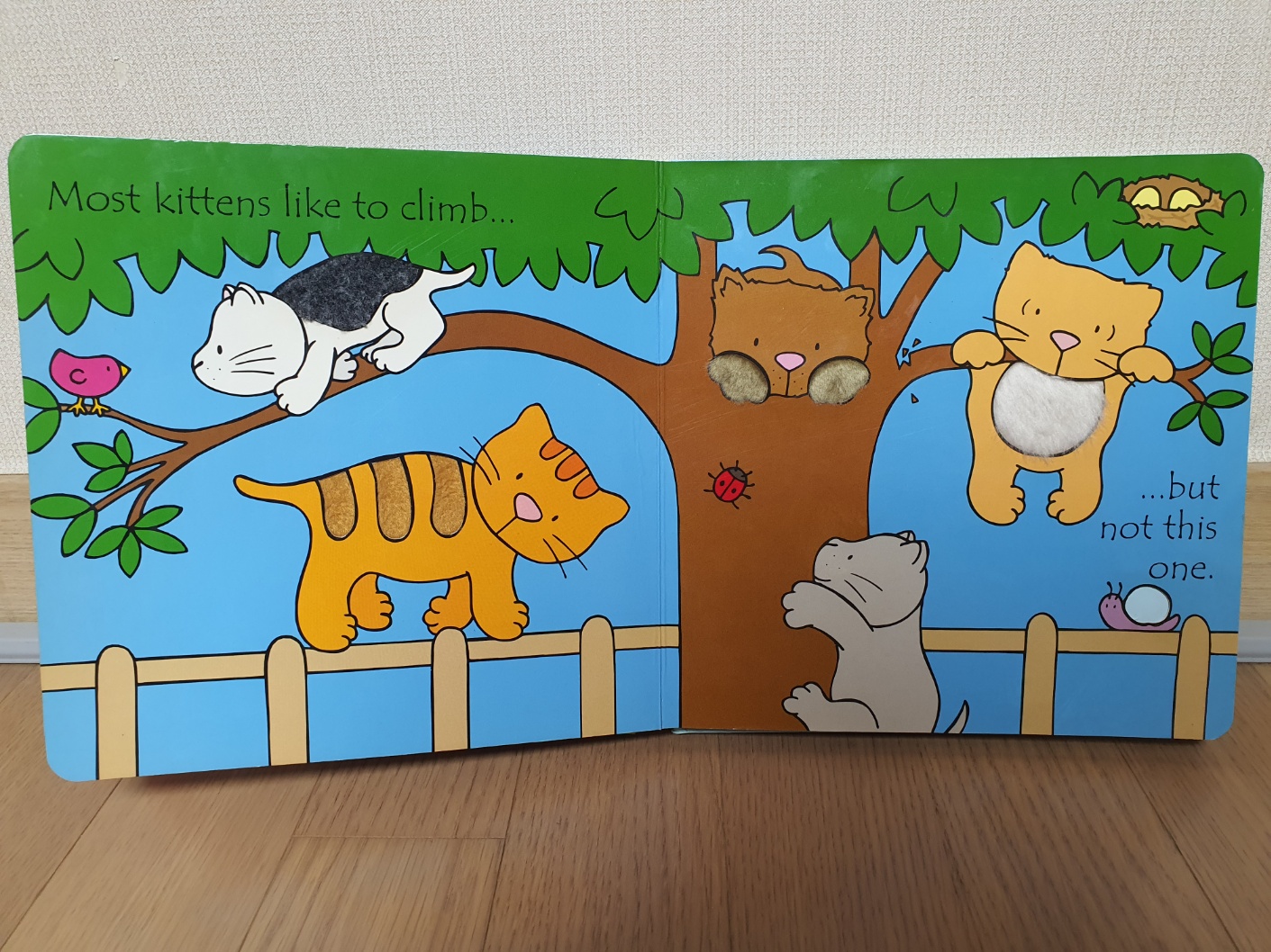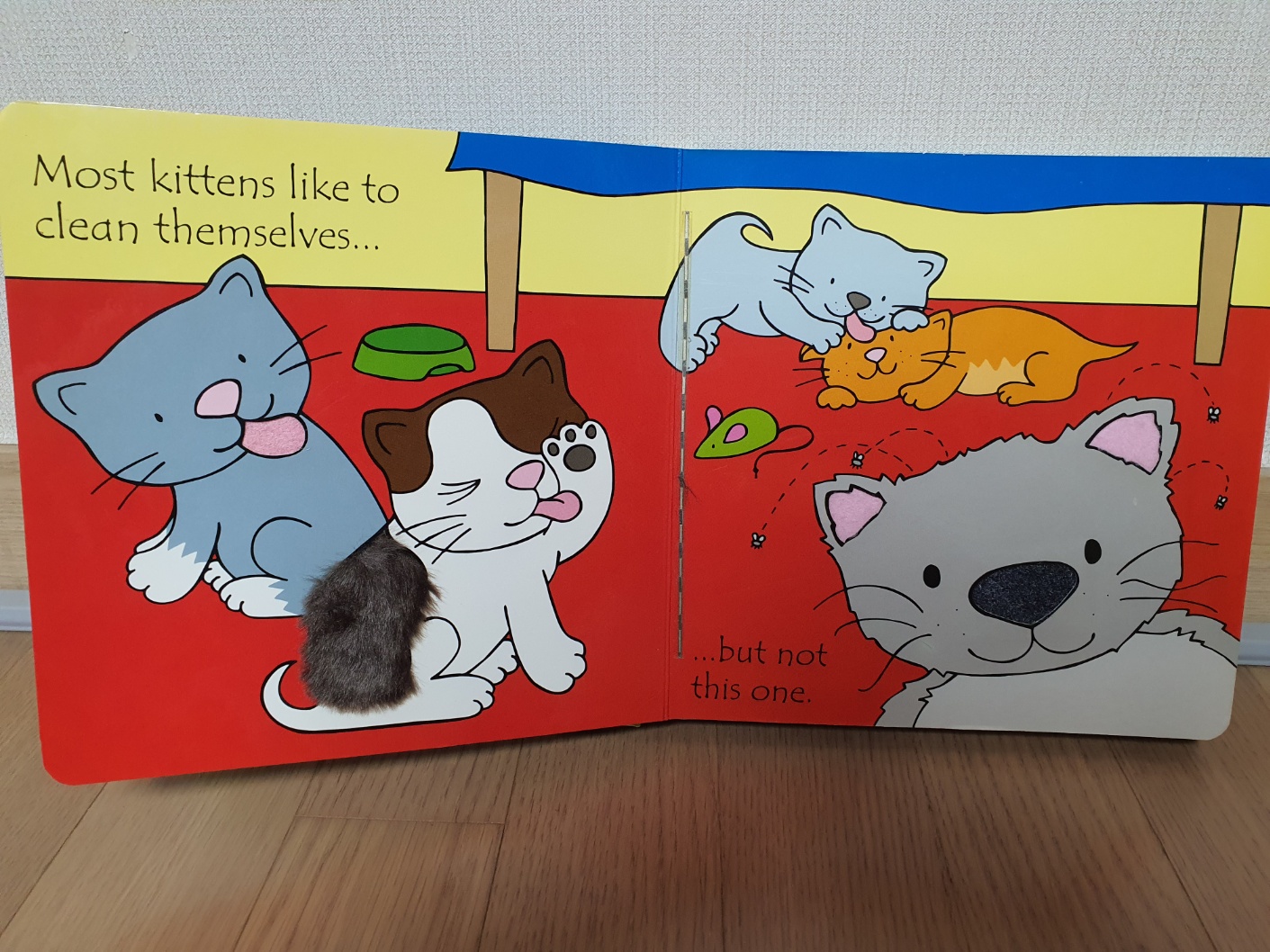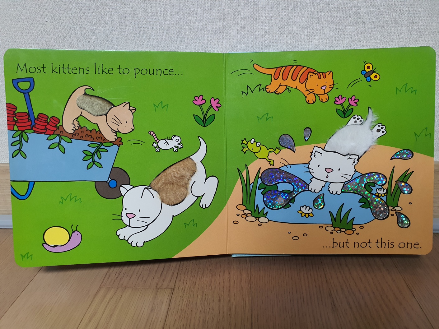 각 페이지마다 다른 고양이를 소개합니다. 각 고양이들이 좋아하는 것들을 소개하는데 아이는 그 특징을 만져보며 감각을 자극받습니다. Most kittens like to라는 문장이 반복되면서 몇 장 안 되기 때문에 복잡하지 않고 쉽게 다다 갈 수 있는 책입니다.