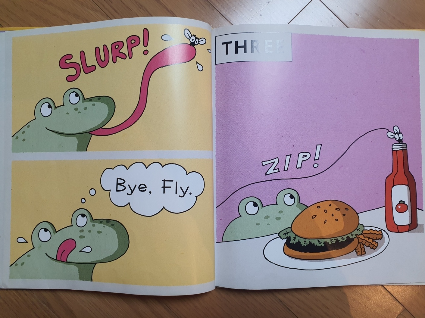 여태 봐왔던 영어책들과 달리 만화형식으로 그려져 있는데 짧고 유머러스한 이야기로 구성되어 있었기 때문에 읽기에도 쉬웠고 개구리와 파리사이에 벌어지는 짧은 에피소드들이 반복적인 문장과 재치 있는 대사가 재미있었습니다. 그래서 책을 다 읽고 나서 아이와 대사를 그대로 얘기하면서 장난을 치고 놀았습니다. 이렇게 자연스럽게 영어를 배우고 상황을 이해하면서 유머감각까지 키워가게 되어 적극적으로 추천하는 책입니다.