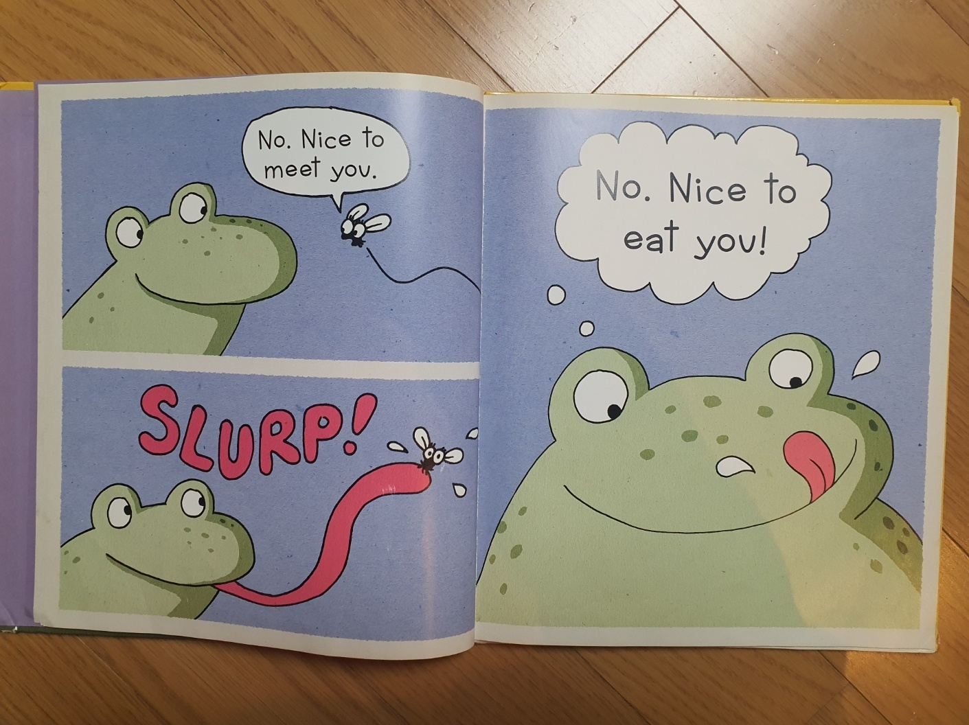 아이가 제일 재미있어했던 내용은 파리가 "Nice to meet you"라고 했는데 개구리는 "Nice to eat you"라고 대답한 부분입니다. 그러고 나서 파리를 잡아먹었는데 이 부분에서 얼마나 깔깔깔 웃어대던지 이 책을 대출해 온 제가 다 뿌듯하였습니다.^^