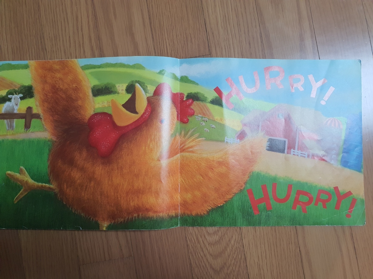 농장에서 동물들이 바쁘게 움직이며 Hurry! Hurry!라고 외칩니다. 닭, 돼지, 소 등 여러 동물들이 점점 긴박한 분위기 속에서 한 방향으로 달려가고, 독자는 무엇이 그렇게 급한 일인지 궁금해하게 됩니다. 결국 동물들이 모인 곳에는 새로 태어난 아기 병아리가 있고, 모든 동물들은 기쁨과 환호 속에서 이 특별한 순간을 맞이합니다.