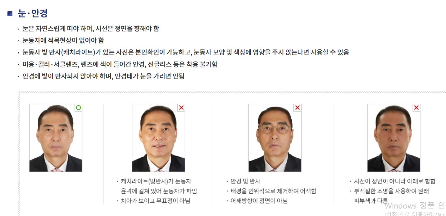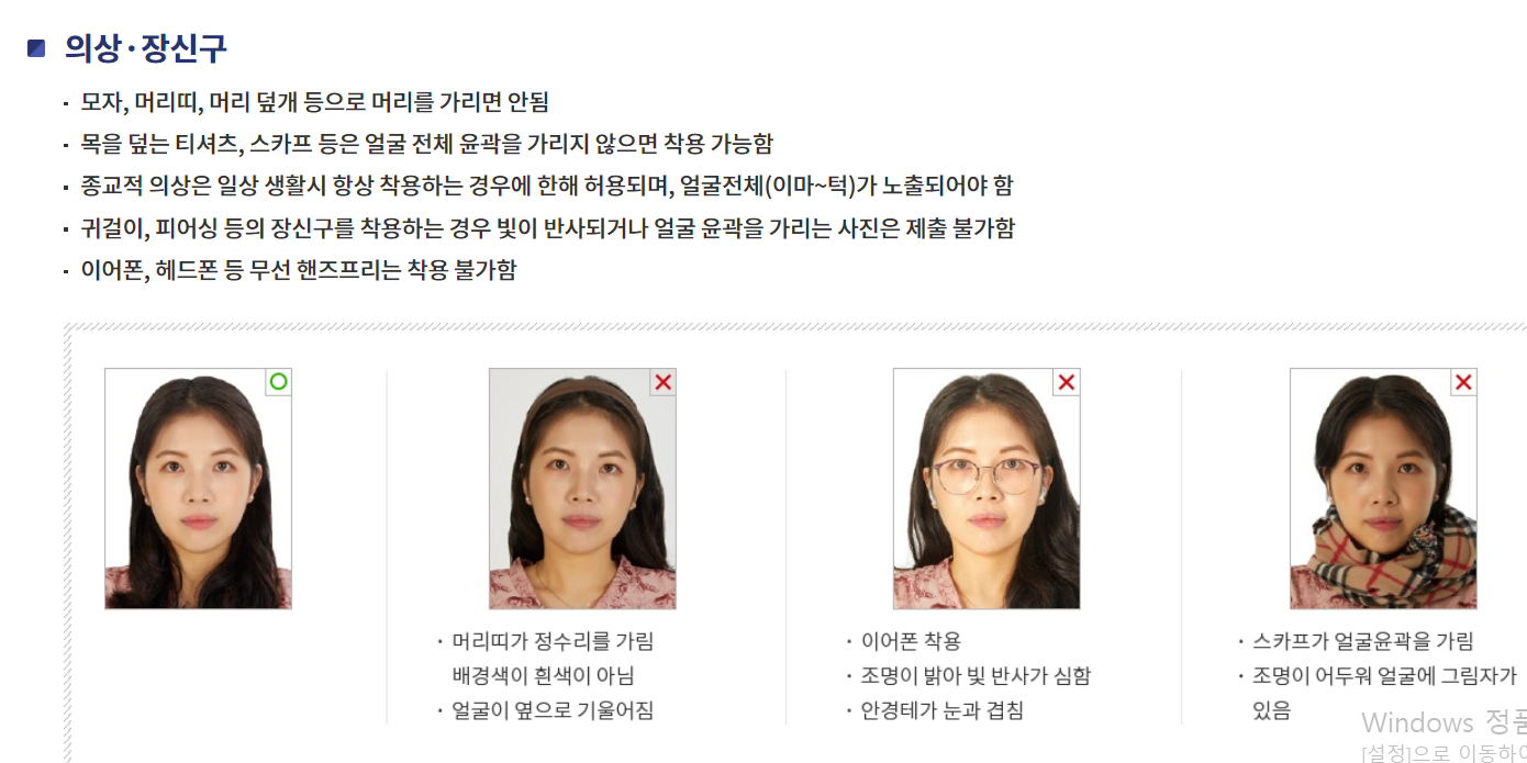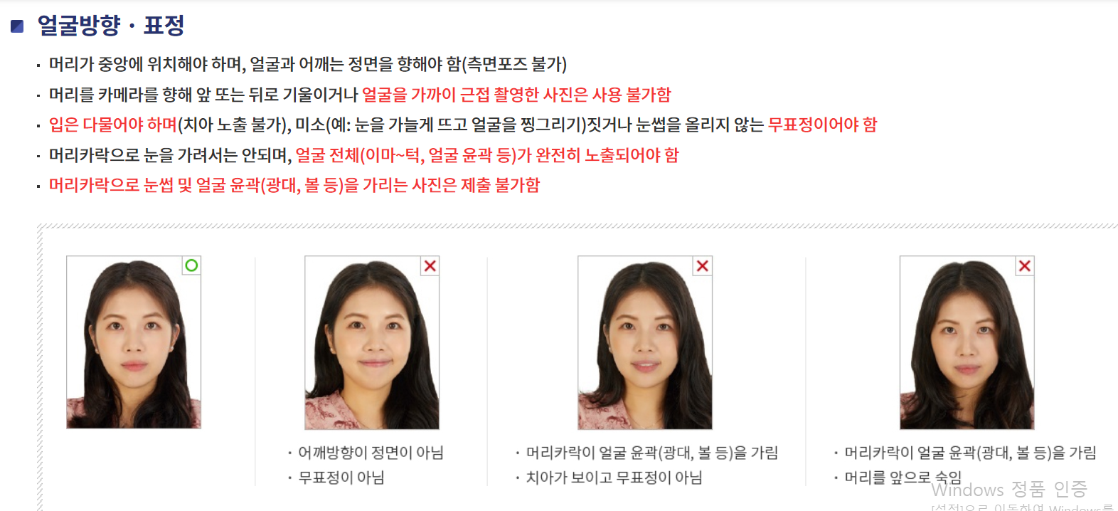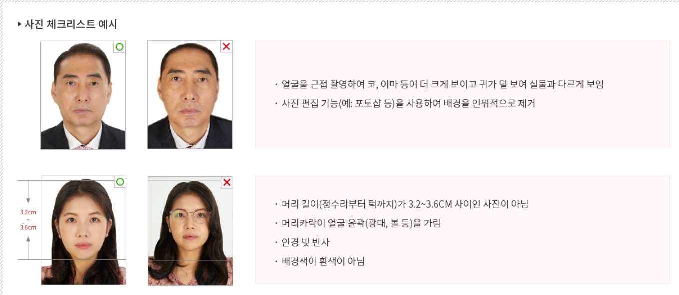 본인이 직접 촬영한 사진은 여권사진 규격에 적합한 경우에만 사용 가능함.