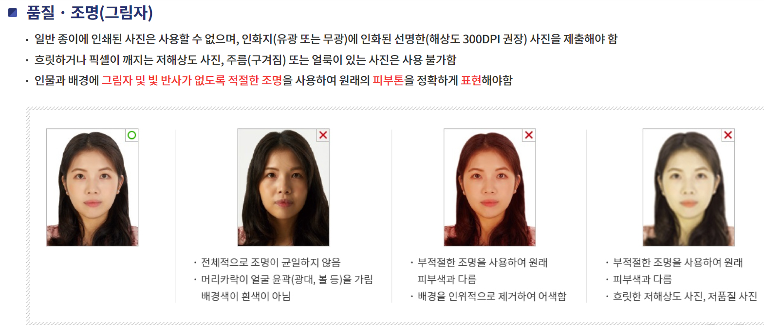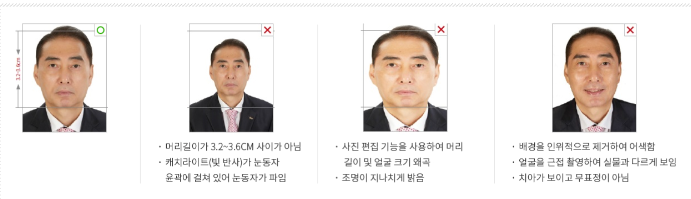 본인이 직접 촬영한 사진은 여권사진 규격에 적합한 경우에만 사용 가능함.