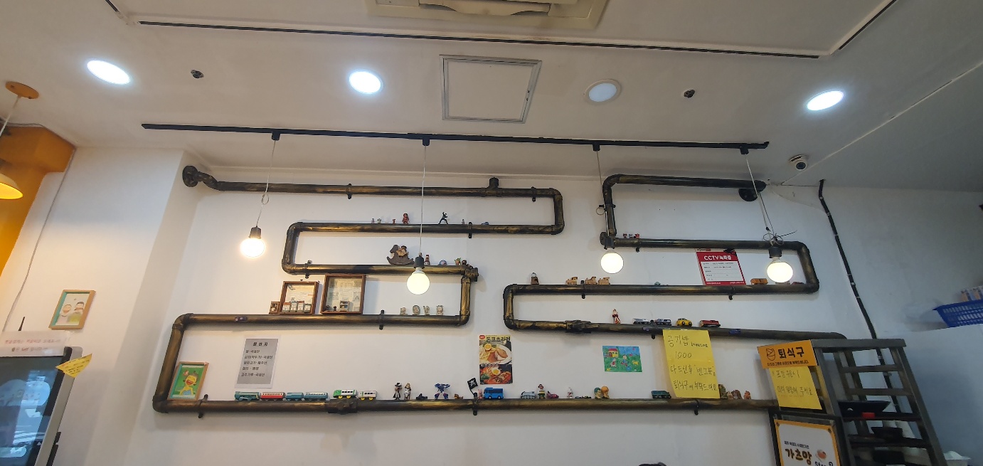 일단 내부 한쪽 벽에 있는 인테리어가 아이의 마음을 사로잡았습니다. 아이가 5세이지만 식당에 가서 진득하게 잘 앉아 있지 않으려고 하는데 돈가스 한입 먹고 장난감들을 구경하고 한 입 먹고 구경했습니다. 아이의 눈에는 파이프와 파이프 위에 아기자기한 장난감들이 있으니 신기했나 봅니다.