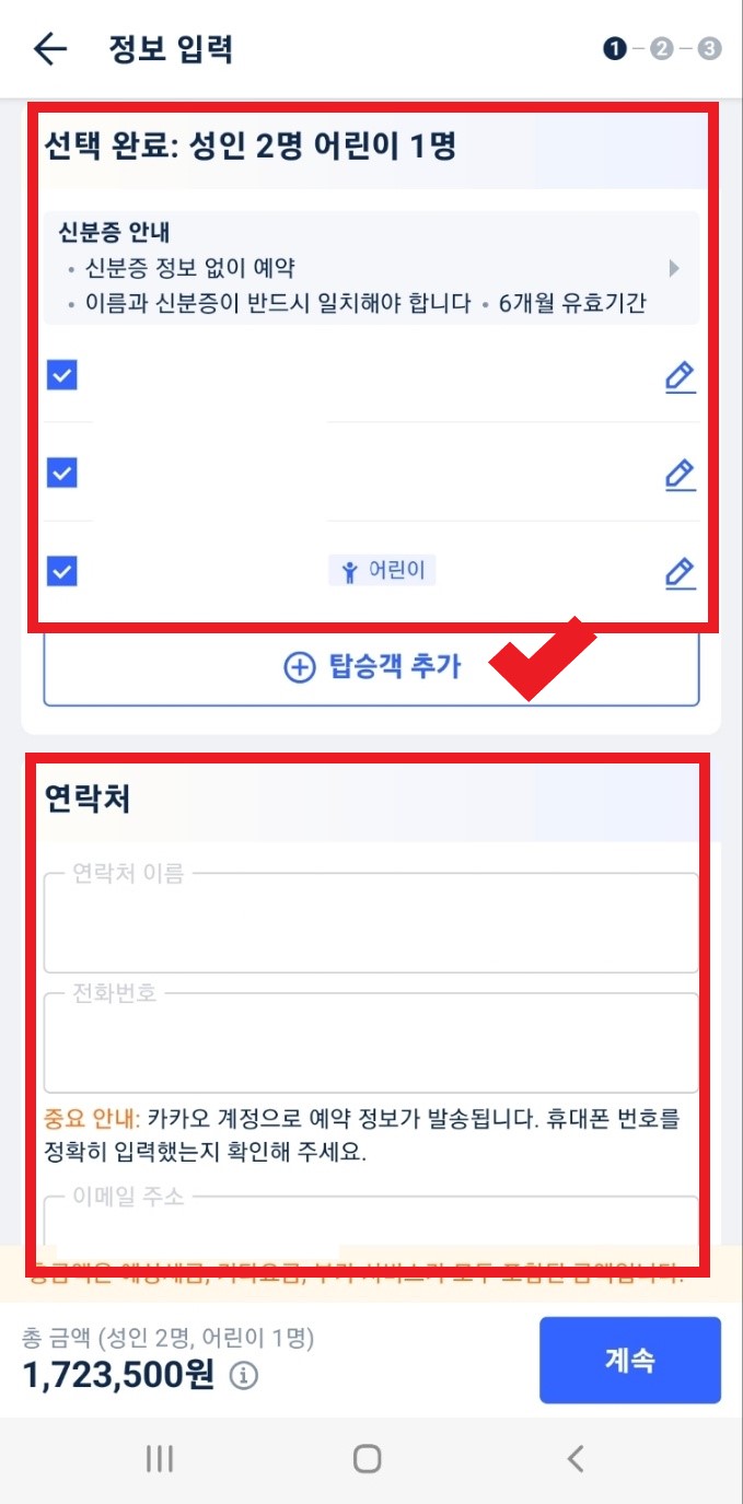 7. 정보입력란에 탑승객 추가 버튼을 눌러서 추가해 주시고 연락처를 먼저 입력합니다.