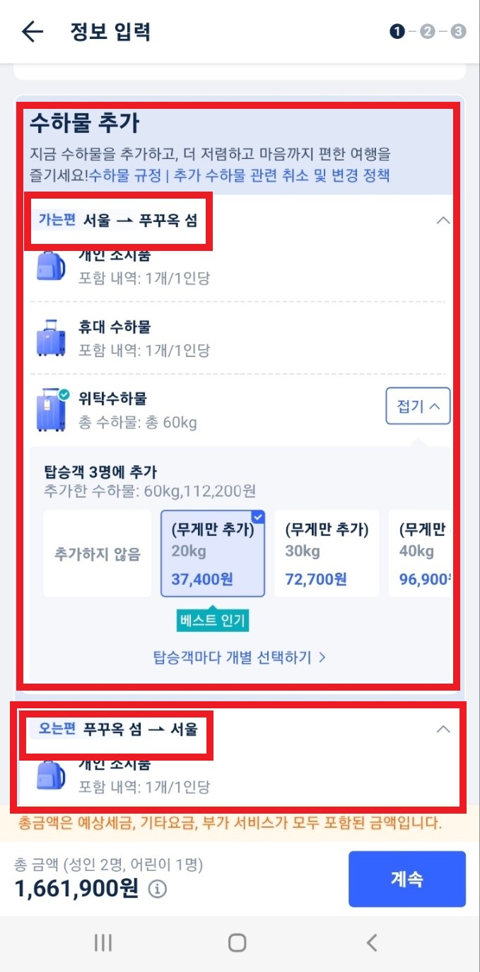 ★이때 중요한 점은 가는 편, 오는 편 각각 눌러서 수하물을 추가해 주셔야 합니다.★
